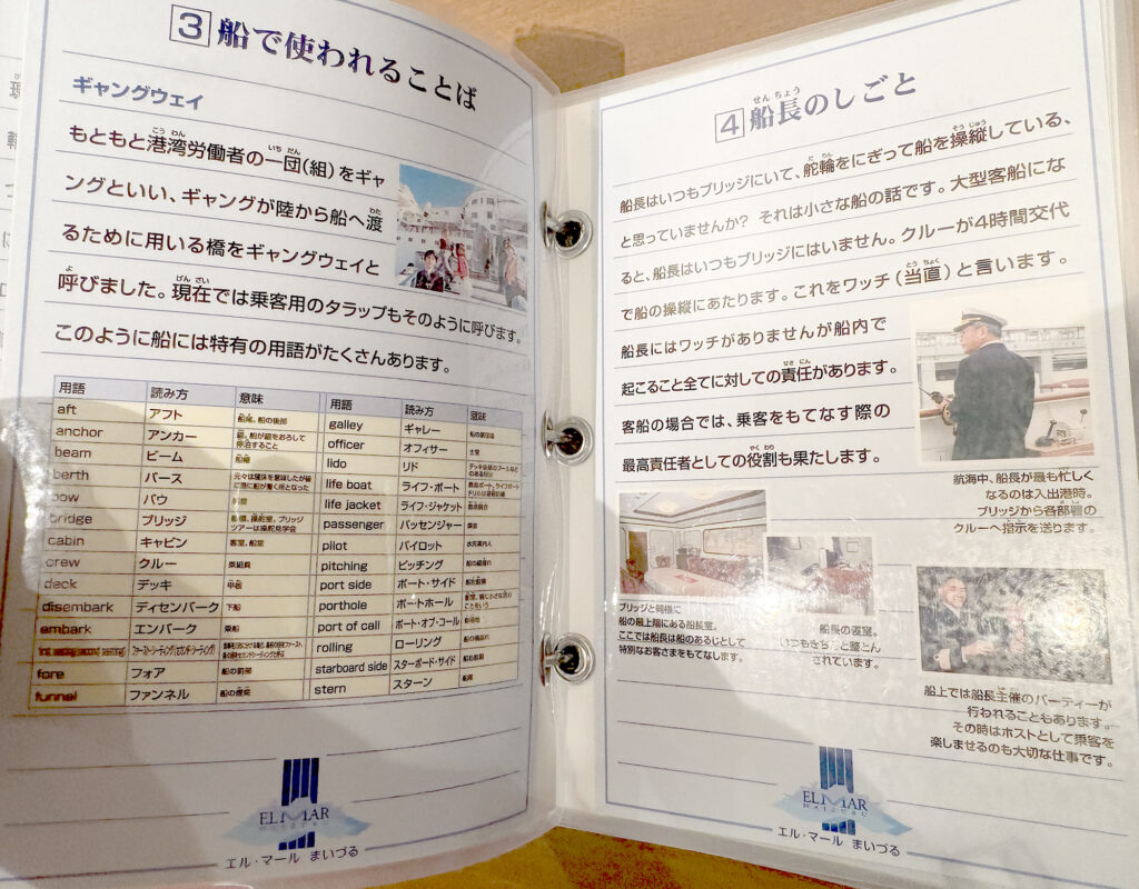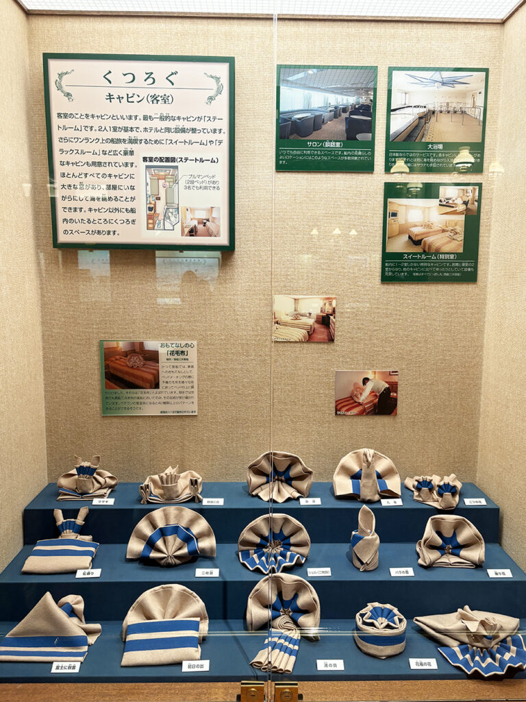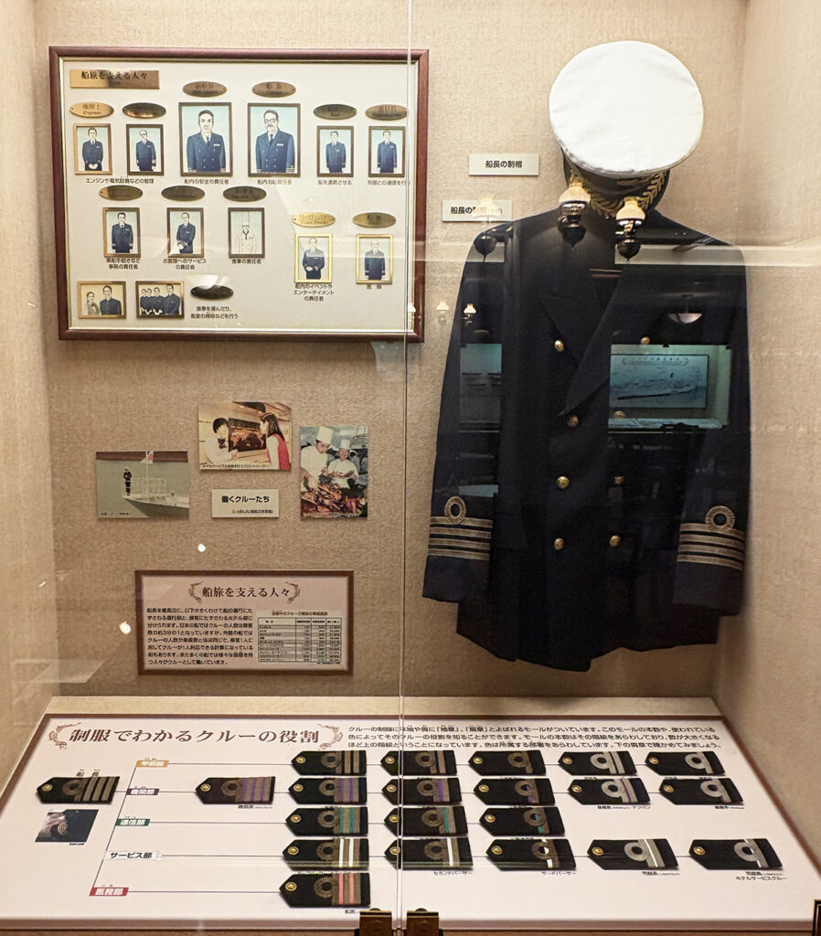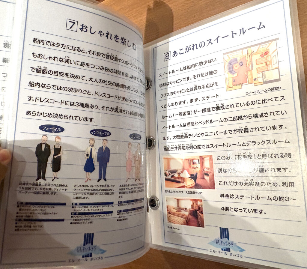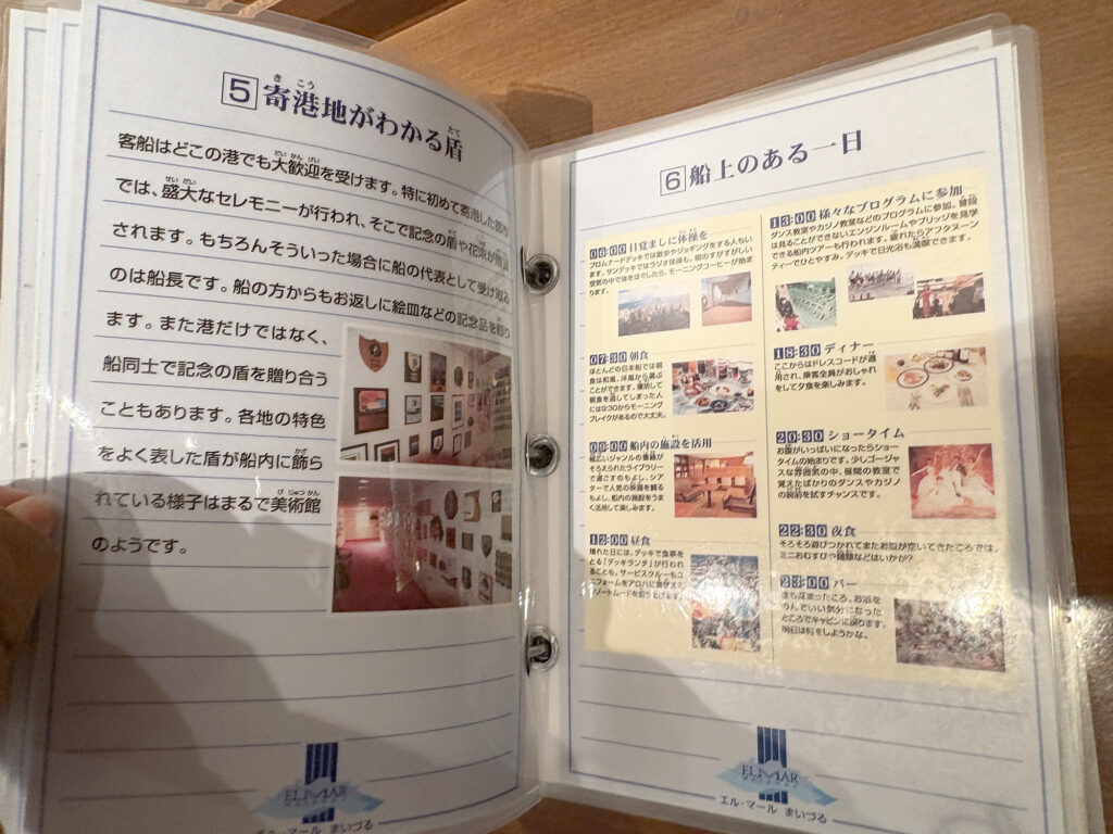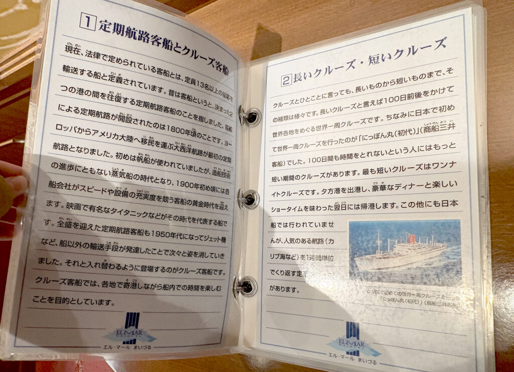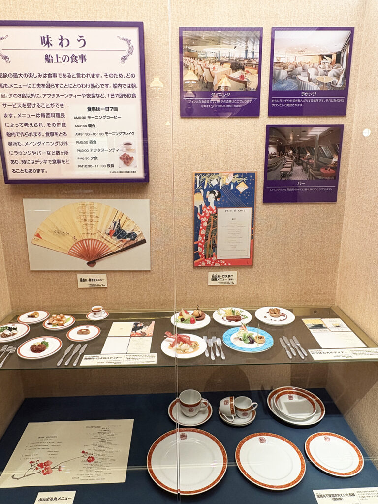 施設内のパンフレットでは、当時の豪華客船での生活や運営について、視覚的にわかりやすく説明されていました。