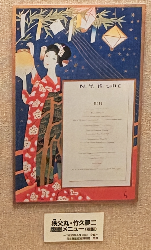 【施設展示情報】船上の食事コーナーでは、メニューカバーが展示されています。その中に、竹久夢二がデザインした作品が使用されていました。