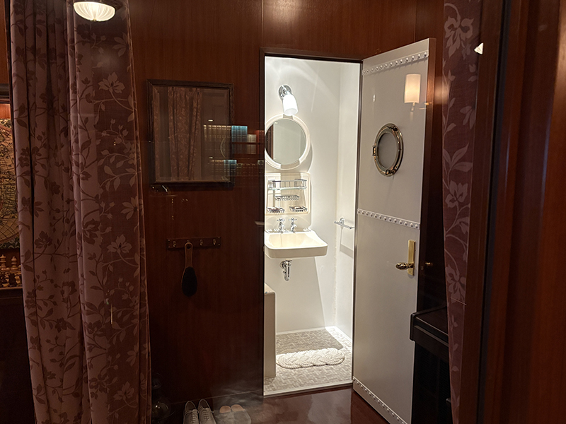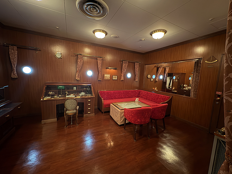 重厚な家具、温かみのある照明、木製のパネリング、円形の舷窓(ポートホール)、赤いベルベット素材のソファ…細部にわたって「昔の豪華客船」の雰囲気が再現されています。