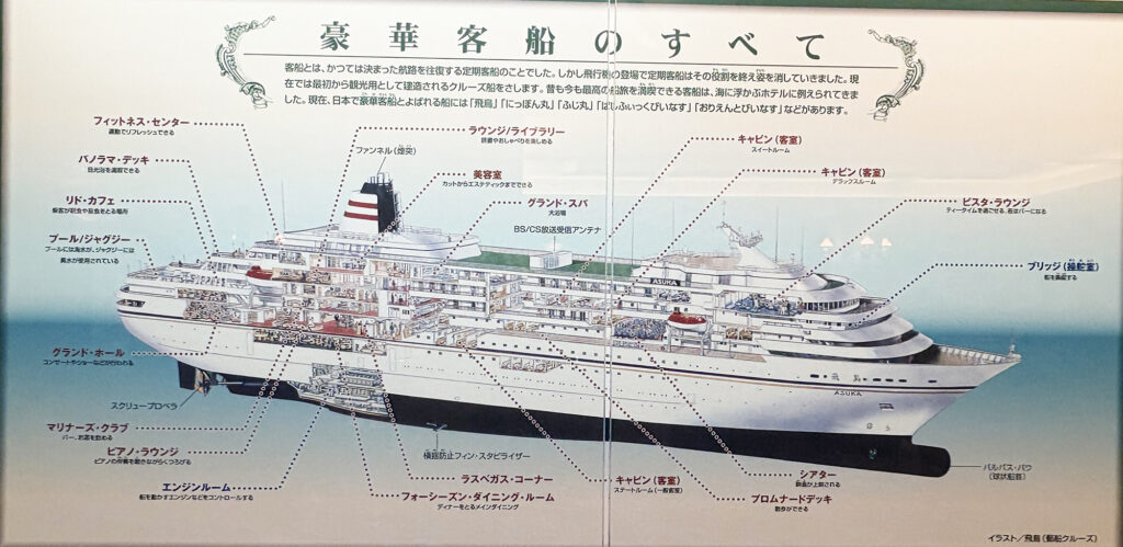 豪華客船の空間って、普段なかなか味わえるものではないし、デザインはポスターや紙ものだけじゃなく、空間・案内・体験の流れ全部に宿るんやなあと、またひとつ勉強になりました。しかも無料。すごい。こういう場所に出会うと、予定外でも寄ってみるもんやなと思います。