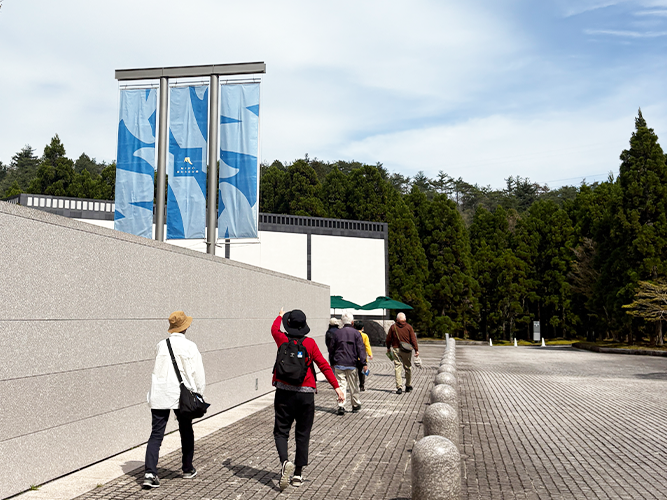 グレーの壁沿いを歩くと、正面にMIHO MUSEUMのブルーのバナーが見えてくる。開放的な空と緑が迎えてくれる。