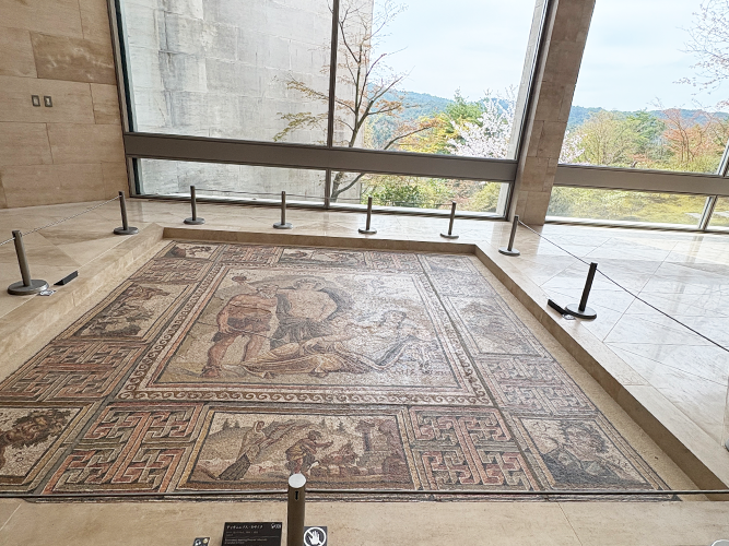 🟢 MIHO MUSEUMは古代ローマ・ギリシャ・エジプト・西アジアなど世界各地の古代美術品も常設展示している。このモザイクはローマ時代のもの。