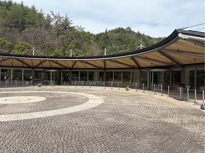 🟢 チケット購入・インフォメーションがあるレセプション棟は、半円形の曲線屋根が特徴的な建物。日本的な大屋根の曲線とガラスと金属フレームが融合したデザイン。