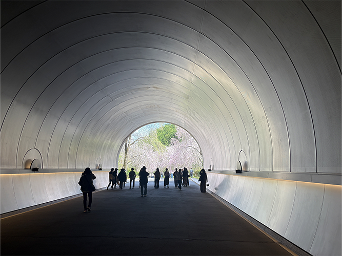🟢(建築情報)全長約216m。このトンネルは普通のトンネルと違って、コンクリート打ちっぱなしではありません。わざわざ、銀色の板を内側に貼り付けています。多くの建築評論家が「時空を越えるトンネル」と評しましたが、この銀色の壁は山の緑を、ある時は桜の薄桃色を映し、季節の中で微妙に表情を変えていきます。