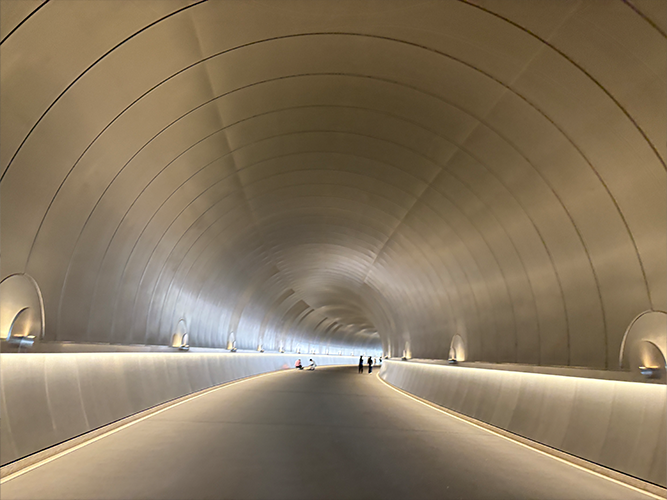 トンネル内は近未来的で異空間。日常から切り離されるような感覚。