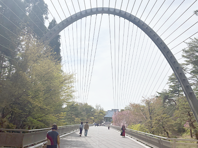 橋を渡りながら見る山の景色も美しい。展示室棟が遠くに見えてくる。